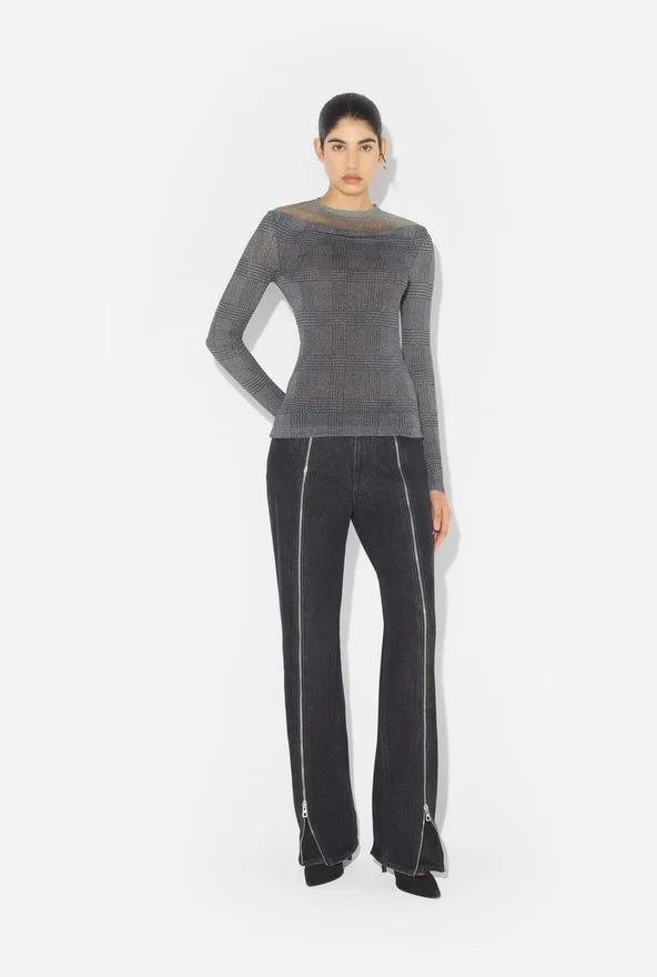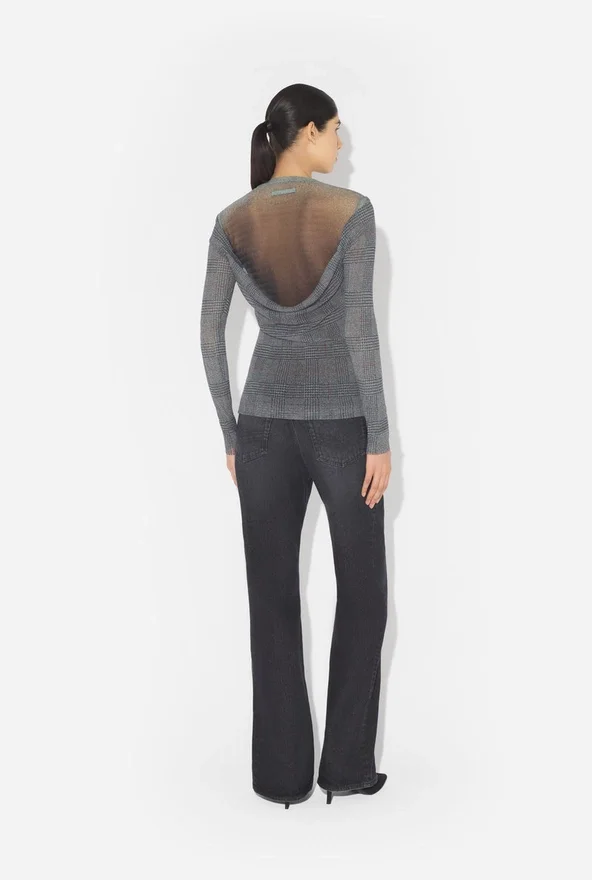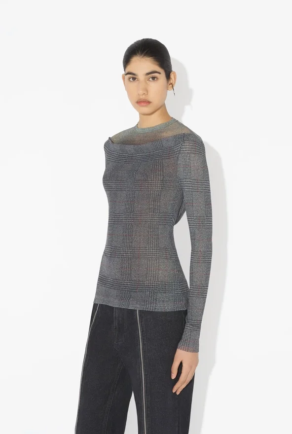 Grijze tule top met lange mouwen en ‘Prince of Wales’-print.- Nauwsluitend