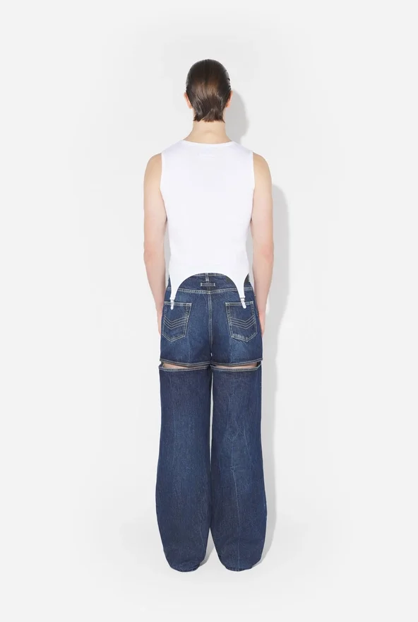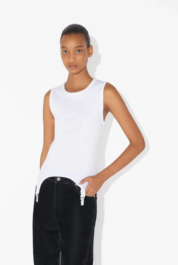 Witte geribde katoenen tanktop met jarreteldetails en Jean Paul Gaultier-medaillon.