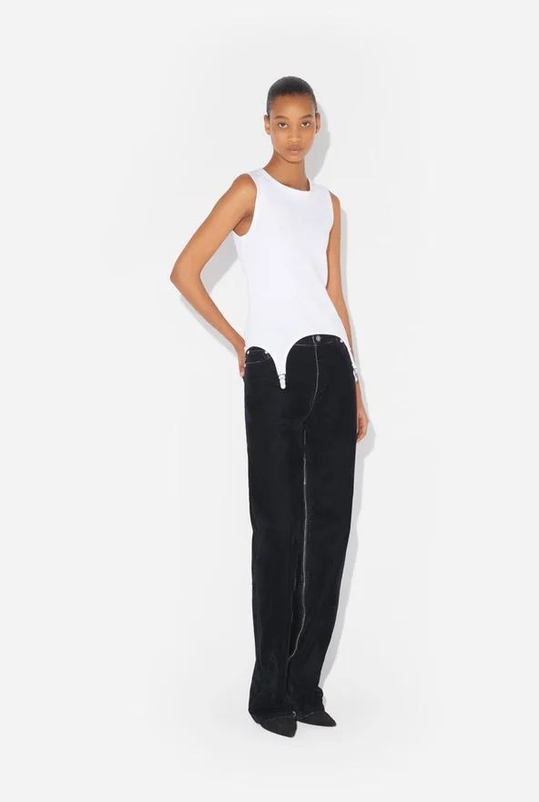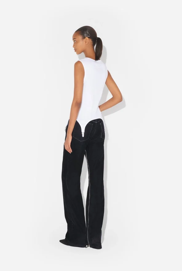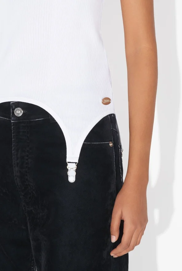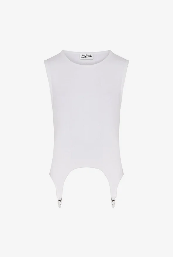 Ontdek de witte tanktop met jarretelles van Jean Paul Gaultier.